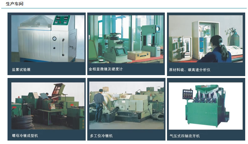 我公司全部引进台湾先进的多工位冷墩成型机,国内较为先进的热处理生产线。同进引进先进的液压拉力试验机、硬度计、化学分析仪、显微镜、探伤机等检测设备。